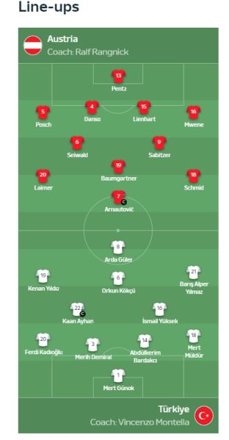 7月3日讯 欧洲杯1/8决赛,奥地利vs土耳其的比赛将在莱比锡体育场打响,赛前双方公布首发阵容。