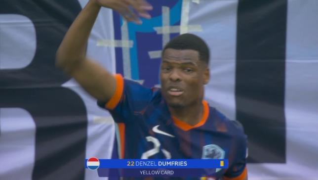 7月3日讯 欧洲杯1/8决赛,罗马尼亚vs荷兰。比赛第78分钟,邓弗里斯掷边线球时由于拖延时间,被主裁判出示一张黄牌。