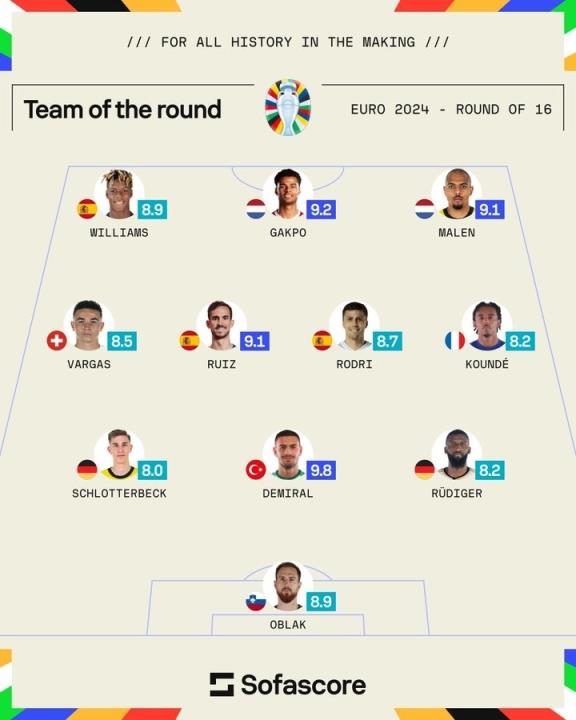 7月4日讯 欧洲杯16强战已经落幕,sofascore也统计了本轮评分最佳阵,西班牙3将、德国荷兰各2人。