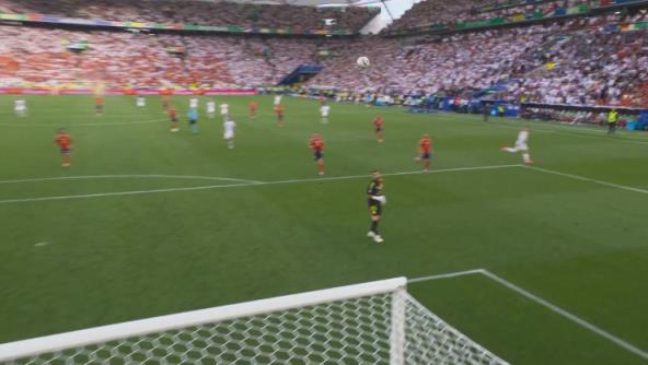 07月06日讯 西班牙vs德国第83分钟,西蒙开球失误,哈弗茨断球吊射高出!
