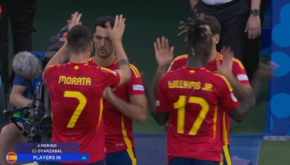07月06日讯 欧洲杯1/4决赛,西班牙vs德国,比赛第79分钟,尼科-威廉姆斯、莫拉塔下场,梅里诺、奥亚萨瓦尔登场。