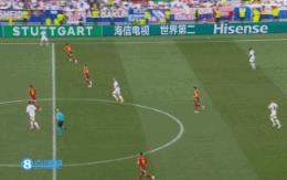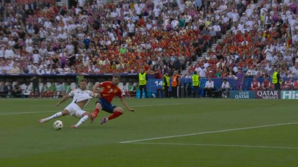 07月06日讯 西班牙vs德国第77分钟,维尔茨传中,菲尔克鲁格在纳乔防守下击中立柱,慢镜显示2人互拉球衣!