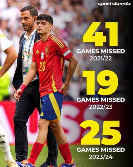 佩德里近年来多次遭遇伤病,2021/22赛季因伤缺阵41场,2022/23赛季伤缺19场,2023/24赛季伤缺25场。