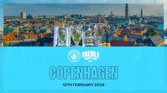曼城三冠王奖杯巡展来到丹麦,五座冠军奖杯将在丹麦首都哥本哈根展出。