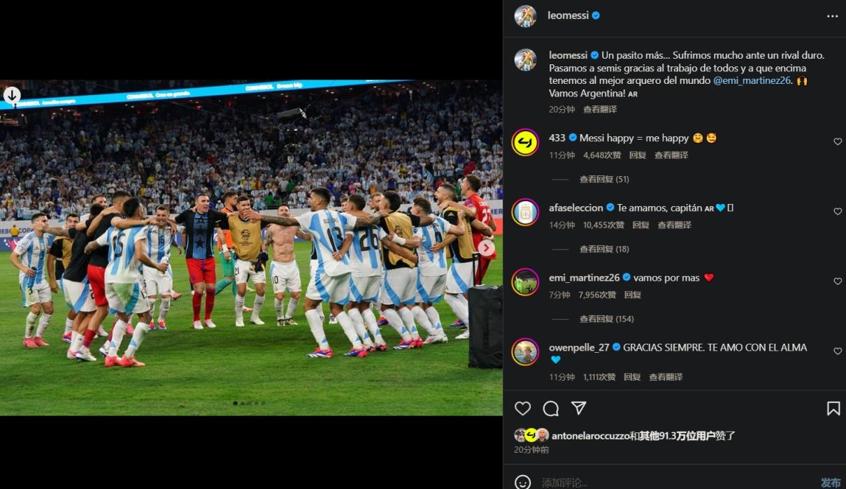 梅西晒出全队一起庆祝获胜时的合照,并写道:“又前进了一步......面对强劲的对手,我们吃了不少苦头。感谢大家的努力,我们闯入了半决赛,这也是因为我们拥有全世界最好的门将,@马丁内斯。