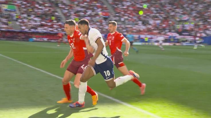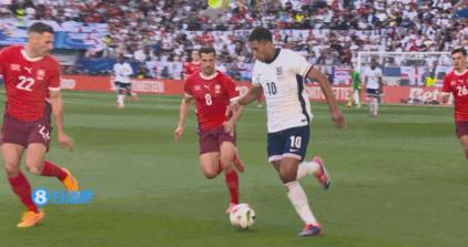 07月07日讯 英格兰vs瑞士第32分钟,贝林厄姆反击带球倒地,奥尔萨托认定沙尔战术犯规出示黄牌。