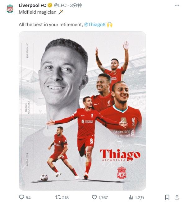 利物浦官推晒出了蒂亚戈的海报,并写道:“中场魔术师,祝你退役后未来一切顺利!”