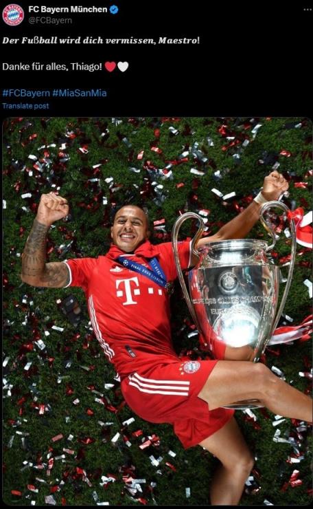 拜仁官推晒出了蒂亚戈与欧冠冠军的合影,并写道:“足球会想念你的,大师!感谢你带来的一切,蒂亚戈!”