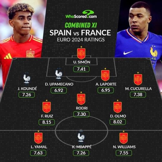 7月10日讯 西班牙和法国即将迎来焦点战,whoscored也根据本届欧洲杯场均评分列出了两队合体最佳阵容,西班牙8人在列。