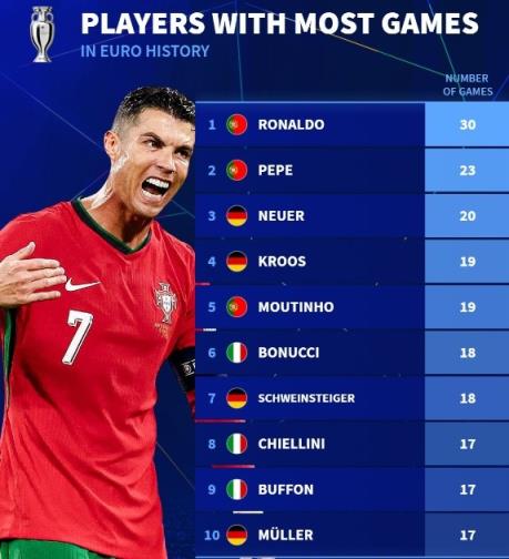 7月10日讯 欧洲杯仅剩最后3场比赛,C罗、克罗斯等名将也已经确定就此告别欧洲杯,《转会市场》也统计了欧洲杯历史出场榜情况。