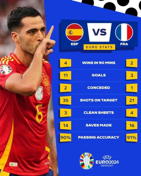 7月10日讯 西班牙和法国将在今晚欧洲杯半决赛迎来强强对决,欧洲杯官推也统计了两队本届赛事的关键数据: