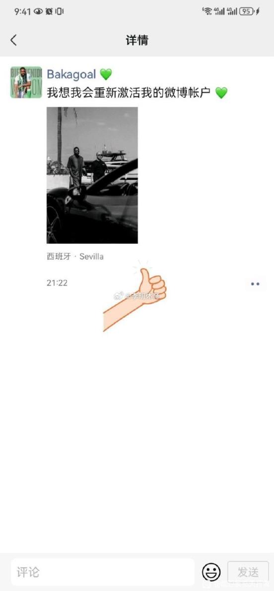 7月12日讯 博主“李明体育”晒照,巴坎布在朋友圈透露,他会激活微博账户。