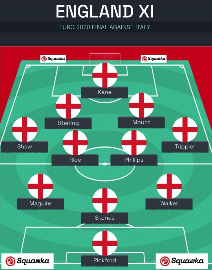 英格兰首发:1-皮克福德、3-卢克-肖、5-斯通斯、6-马奎尔、2-凯尔-沃克、12-特里皮尔、4-赖斯、14-菲利普斯、19-芒特、10-斯特林、9-凯恩