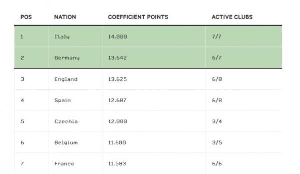 而在本赛季欧战小组赛结束之后,意甲和德甲处于领先位置。曼联和纽卡在欧冠小组赛出局,这影响了英超进入前两名的机会,尤其是意甲和德甲有三支球队进入16强,而英超只有两支。不过根据OPTA的预期模型,英超是获得名额的热门。