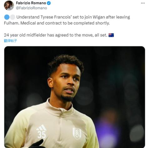 罗马诺在个人社媒写道:“弗朗索瓦离开富勒姆后将加盟维冈竞技,体检和合同即将完成,这位24岁球员同意转会,一切就绪。”
