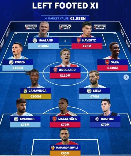 7月22日讯 《转会市场》统计了当今足坛的左脚将最贵阵容,曼城和阿森纳各4将入围。
