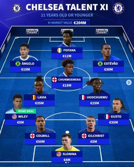 7月23日讯 随着左边路全能的威利加盟,切尔西的青年才俊再添一人。《转会市场》也列出了一套切尔西U21最贵阵。