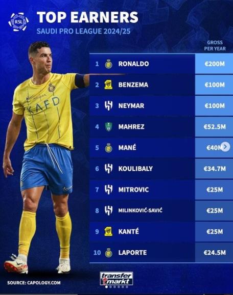 7月23日讯 《转会市场》统计了当前沙特联赛年薪情况,C罗、本泽马、内马尔分列前三。