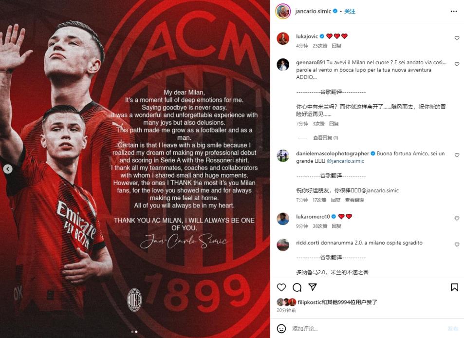 7月24日讯 比利时球队安德莱赫特签下19岁AC米兰中卫西米奇,双方签约至2029年。西米奇在社交平台撰文,回顾了自己的米兰生涯。
