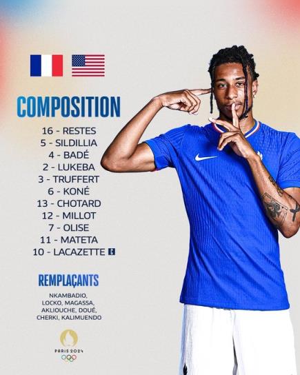 7月25日讯 奥运男足小组赛A组第1轮,U23法国对阵美国U23。赛前,官方公布了本场的首发。