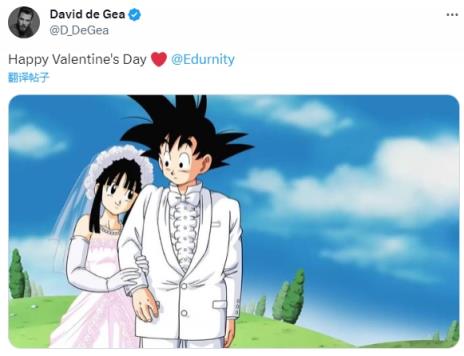 德赫亚是足坛知名二次元,经常在社交媒体发《火影忍者》、《龙珠》等作品的图片。昨天情人节,他就在推特晒出孙悟空和琪琪结婚的照片,并@了妻子写道:“情人节快乐。”