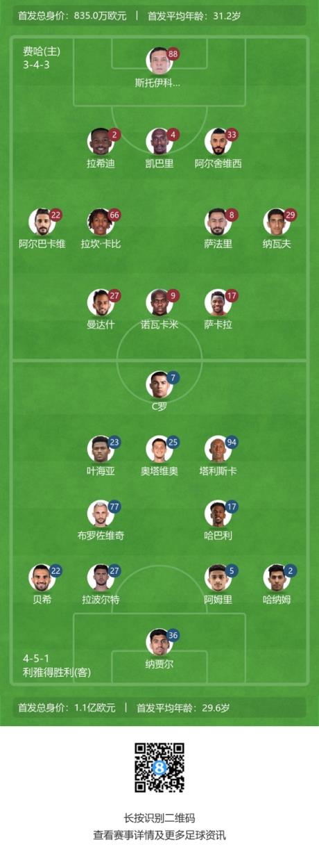费哈首发:88-斯托伊科维奇、2-拉希德、4-萨米、33-阿尔舍维西、66-拉坎、8-萨法里、29-阿尔哈蒂、22-阿尔卡巴维、17-萨卡拉、27-苏丹、9-安东尼-诺瓦卡米