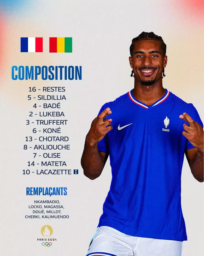 07月28日讯 奥运男足小组赛,法国国奥对阵几内亚国奥,赛前首发公布。