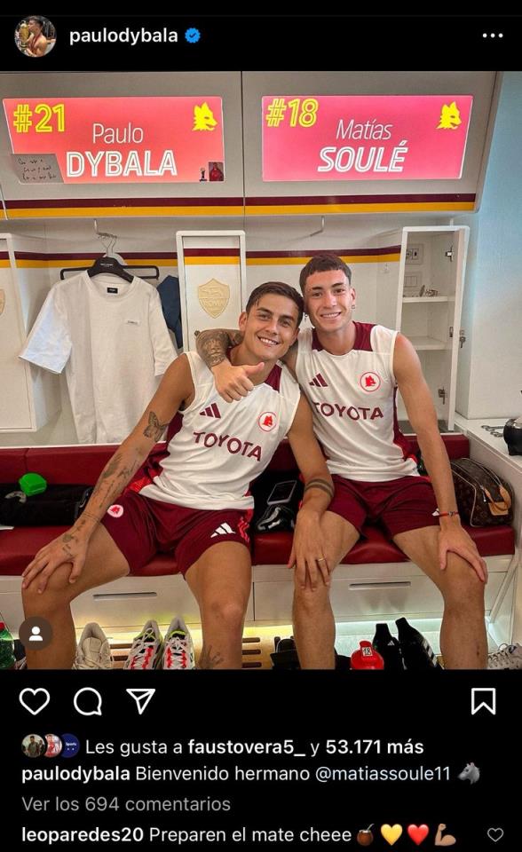 在个人社媒,迪巴拉晒出他与苏莱在罗马更衣室的合照,同时配文:“欢迎你,兄弟”。从照片看,苏莱将身穿罗马18号球衣。