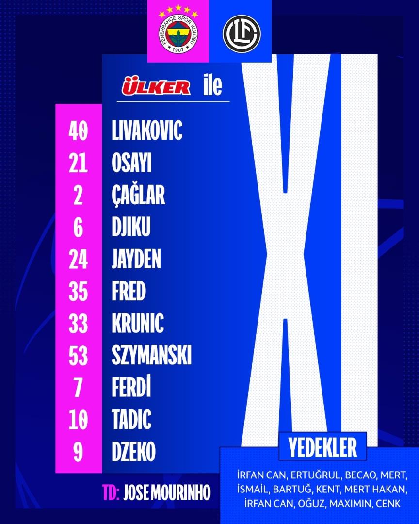 费内巴切首发:40-利瓦科维奇、21-奥萨伊、2-瑟云聚、6-迪库、24-奥斯特沃尔德、35-弗雷德、33-克鲁尼奇、53-希曼斯基、7-费尔迪、10-塔迪奇、9-哲科