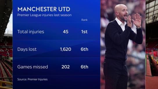 根据统计,曼联上赛季总共遭遇45次伤病,英超最多,球员总计缺席1620天、202场比赛,这两项数据均排在英超第6位。