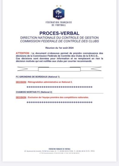 根据该联邦俱乐部控制委员会的决定,波尔多将降级至法丁联赛(全国联赛乙)。波尔多在听证会上为保留法丙联赛资格进行了辩护,但最终无果,他们目前尚未发表任何声明。此外,已经身处法丁的尼奥尔俱乐部也被宣布将再次降级。
