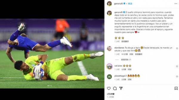 阿根廷门将鲁利在今日发文:“对我们而言,奥运梦想已经结束了。但如果像我们昨天那样在场上全力以赴之后,就可以昂首阔步离开,无需自责。”