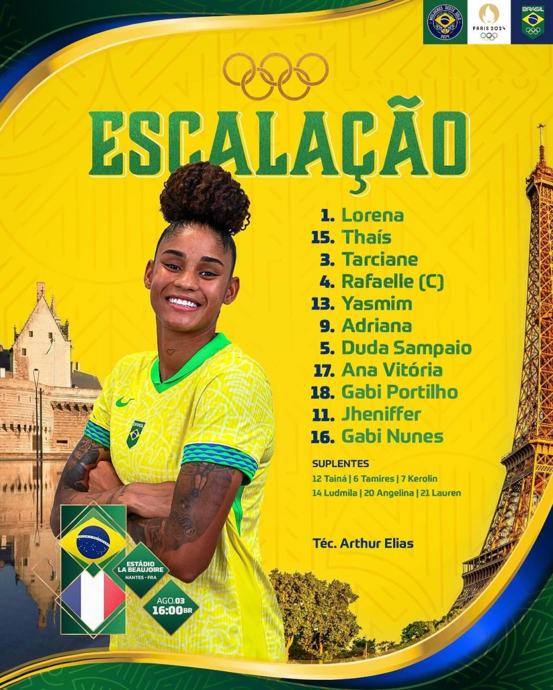 巴西女足首发:1-洛雷纳、3-卡伦、4-拉斐尔、15-泰斯、13-亚斯米姆、5-玛利亚、17-维托里亚、11-杰妮芙、9-阿德里安娜、16-加比-努内斯、18-加比-波蒂奥