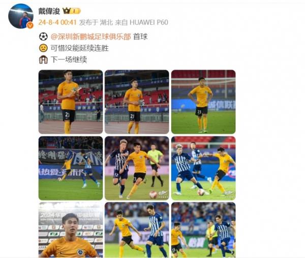 8月4日讯 中超联赛第21轮,深圳新鹏城客场1-4不敌武汉三镇。赛后,为深圳新鹏城攻入一球的戴伟浚发文鼓励自己和球队。