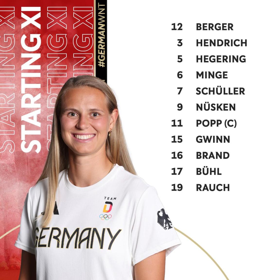 德国女足首发:12-伯格、3-亨德里希、5-黑格林、6-明格、7-舒勒、9-纽斯肯、11-波普、15-格温、6-布兰德、17-布尔、19-劳赫