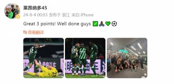 8月4日讯 中超联赛第21轮,浙江队主场4-3击败青岛海牛。赛后,为浙江队攻入一球的外援莱昂纳多发文庆祝胜利。
