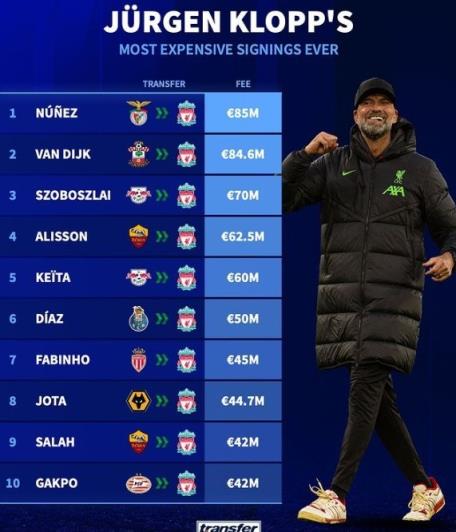 8月8日讯 《转会市场》统计了克洛普执教生涯引援榜,前十均发生在他执教利物浦期间。