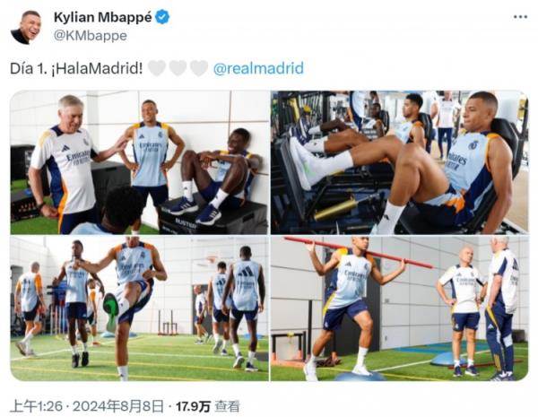 在个人社媒,姆巴佩晒出他参加皇马训练的照片,并配文:“第一天,Hala Madrid”,他还艾特了皇马官方。