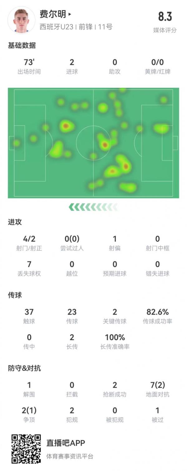 8月10日讯 西班牙在奥运男足决赛领先法国,进球功臣费尔明已经被换下,他本场数据如下: