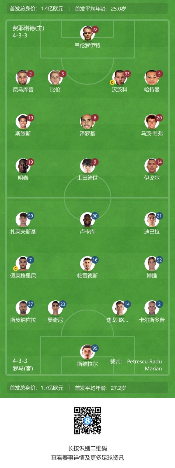 费耶诺德首发:22-维伦罗伊特、2-尼乌库普、3-比伦、33-汉茨克、5-哈特曼、10-斯滕斯、6-泽罗基、20-韦弗、19-明泰、9-上田绮世、14-伊戈尔