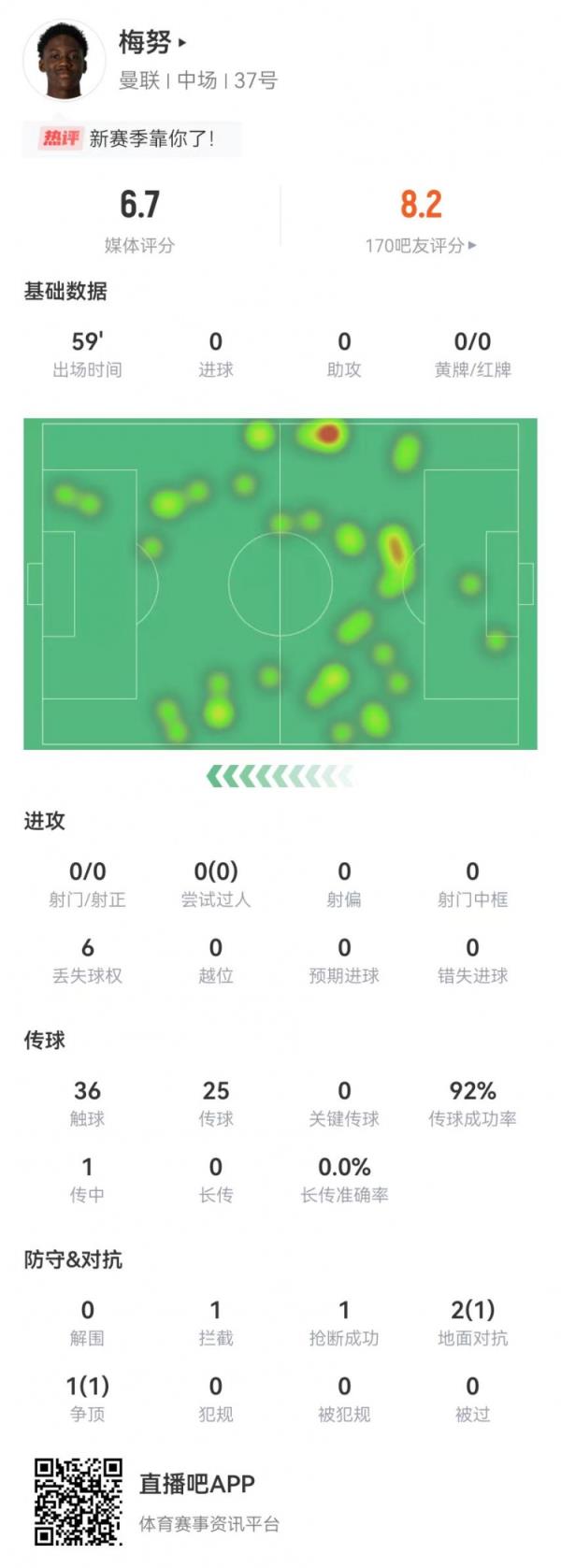 8月11日讯 曼联在社区盾点球不敌曼城,梅努本场数据如下: