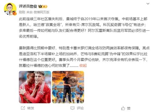 08月11日讯 社区盾对决,曼城点球大战击败曼联夺冠。赛后,詹俊发文点评。