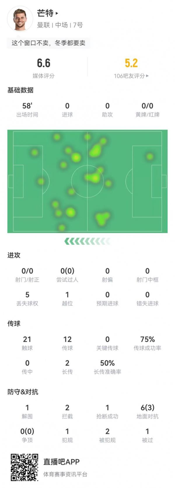 8月11日讯 曼联在社区盾点球不敌曼城,前腰芒特本场数据如下: