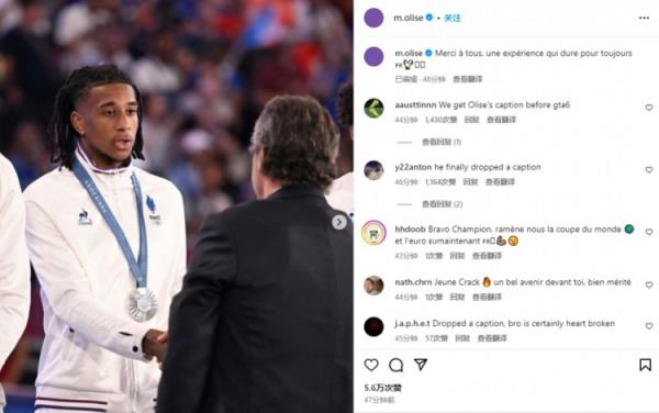 8月12日讯 法国在奥运男足决赛3-5不敌西班牙,遗憾收获亚军。在本届赛事大放异彩的奥利斯通过社媒纪念。