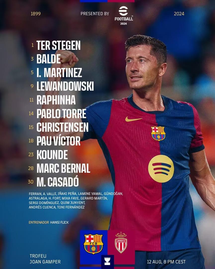 8月13日讯 甘伯杯,巴萨对阵摩纳哥。赛前,官方公布了本场的首发名单。