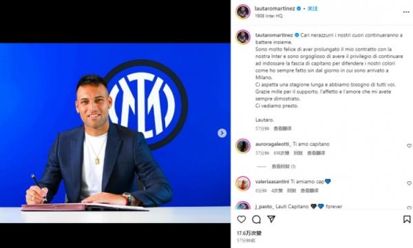 8月13日讯 国米已经官宣和队长劳塔罗续约至2029年,这位阿根廷中锋也通过社媒发文纪念。