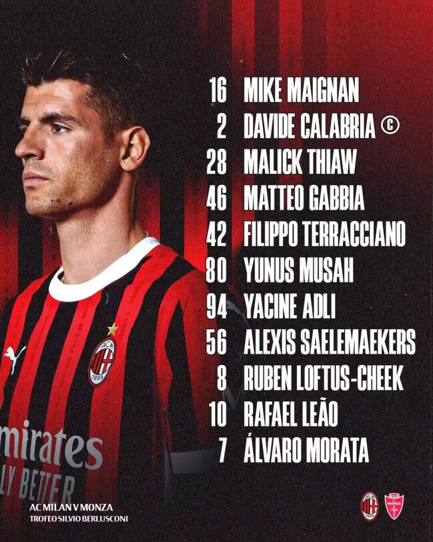 米兰首发:16-迈尼昂、2-卡拉布里亚、28-佳夫、46-加比亚、42-泰拉恰诺、80-穆萨、94-阿德利、56-萨勒马科尔斯、8-奇克、10莱奥、7-莫拉塔