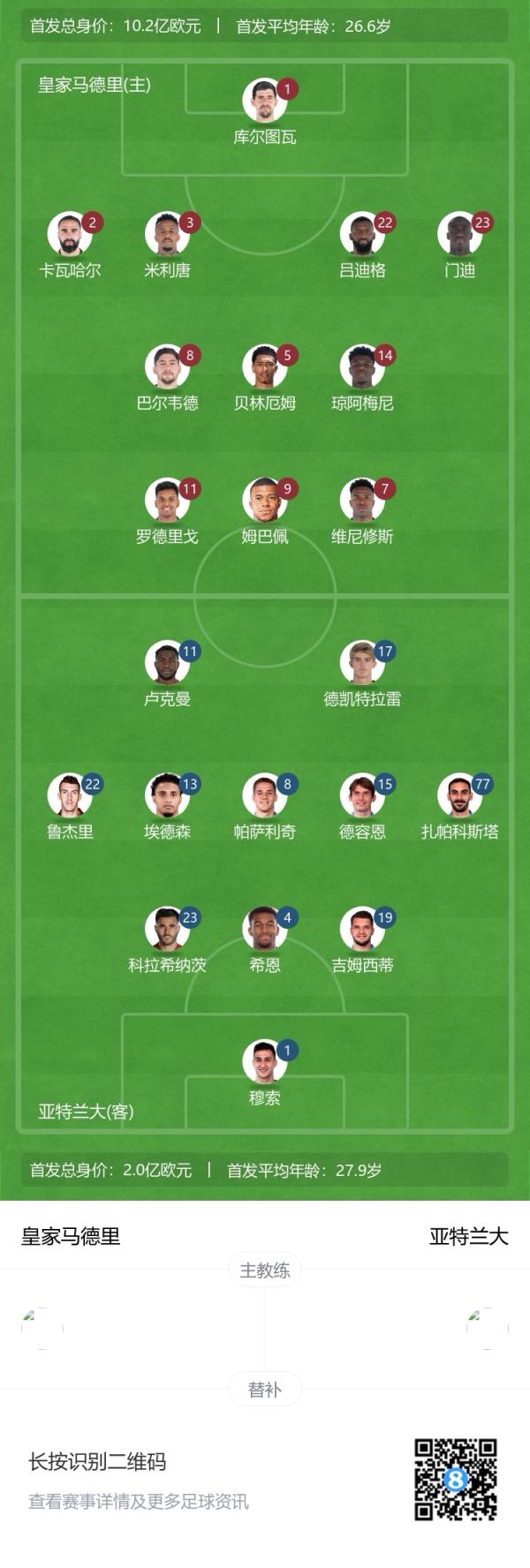 皇马首发:1-库尔图瓦、2-卡瓦哈尔、3-米利唐、22-吕迪格、23-费兰-门迪、14-琼阿梅尼、8-巴尔韦德、5-贝林厄姆、11-罗德里戈、7-维尼修斯、9-姆巴佩
