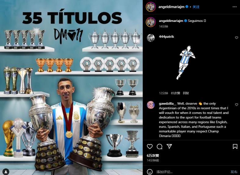 08月15日讯 迪马利亚更新社媒,晒出了他身穿国家队球衣,手捧着两座美洲杯的照片,配文:我们继续。