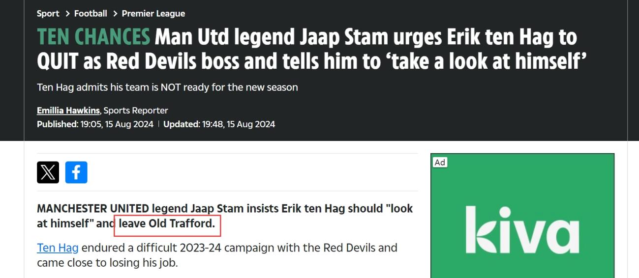 斯塔姆表示:“对于滕哈赫来说这是在曼联的第三个赛季了,我认为他该走人了。”